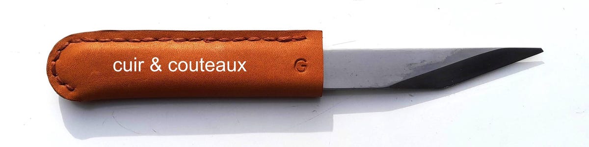 The Le Tranchet table knife, basic version, is a steak knife with an asymmetrical blade and a leather handle.